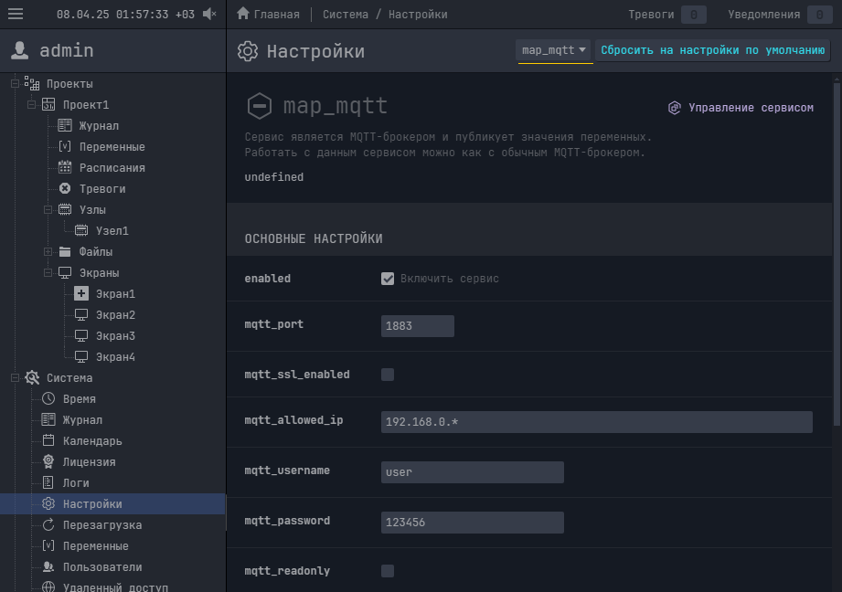 Функции MQTT-карты на сервере выполняет сервис map_mqtt. По умолчанию, сервис включен и принимает MQTT-запросы на порт 1883. В настройках сервиса можно изменить порт, включить SSL или режим Только чтение. Для этого в разделе Система / Настройки выберите сервис map_mqtt и измените требуемые настройки.